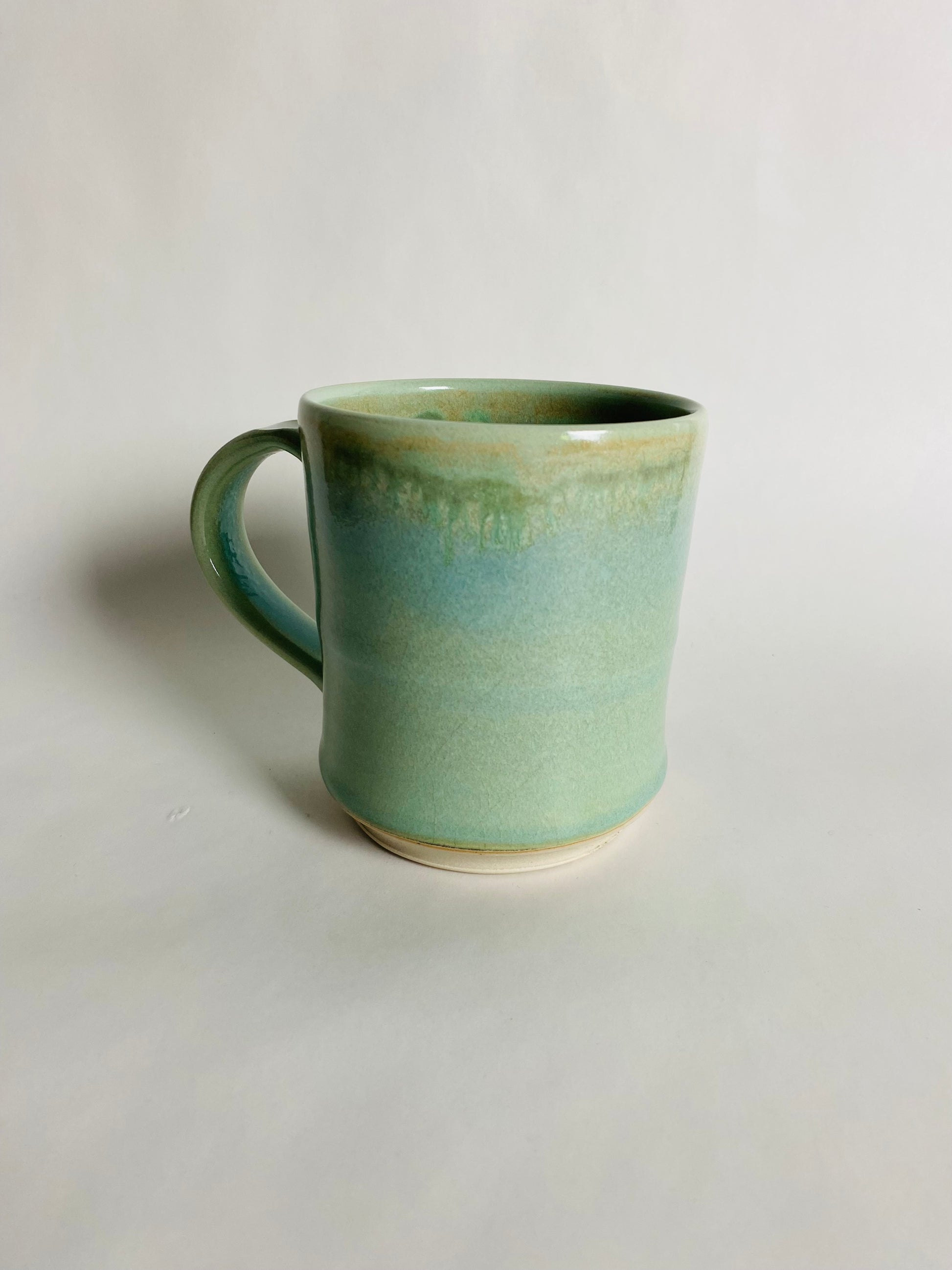 Big and tall mug, light aqua/green glaze. 3.75" wide at the rim x 4.25" tall.