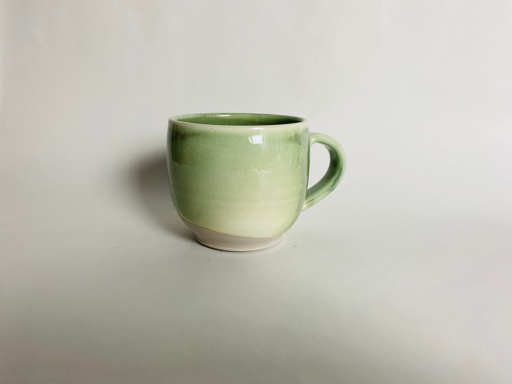 Mug in a light green glaze. 4" wide at the rim x 3.25" tall.