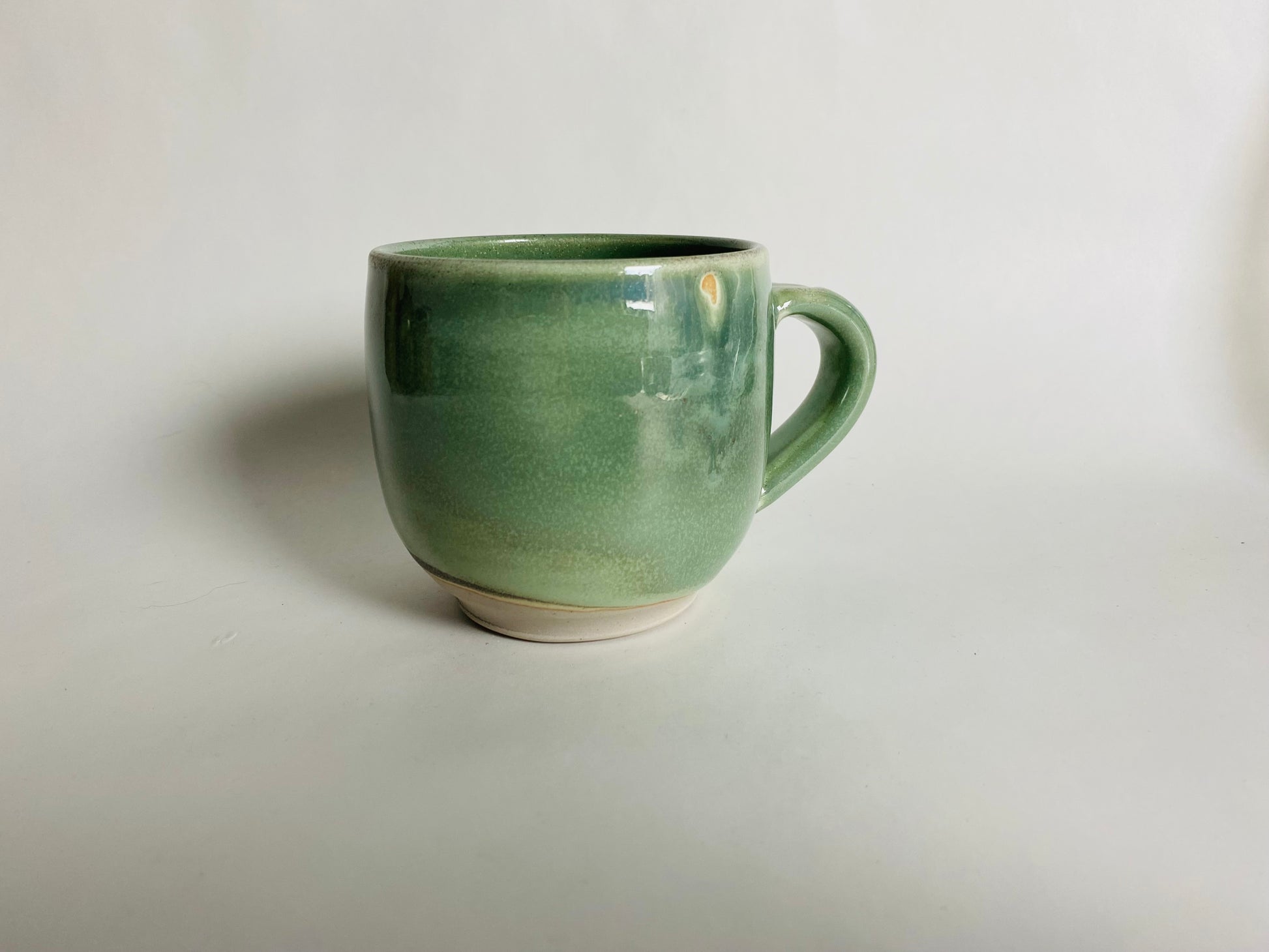 Mug in a light green glaze. 3.75" wide at the rim x 3.5" tall.