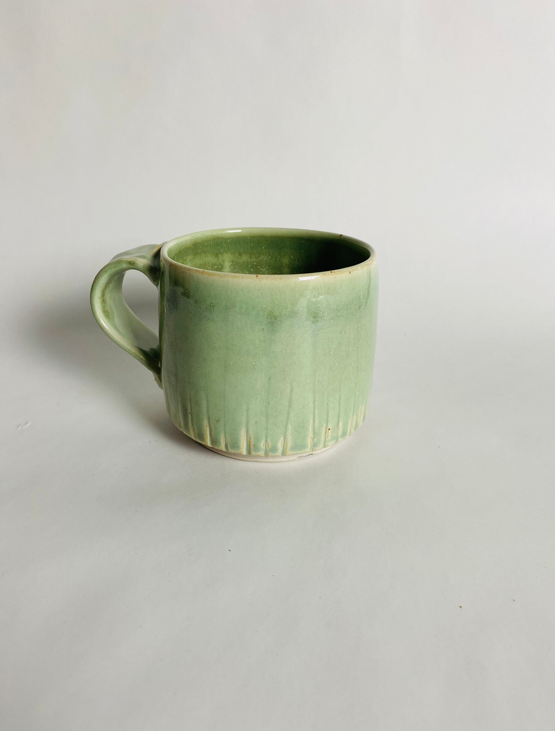 Mug in a light green glaze. 3.5" wide at the rim x 3" tall.