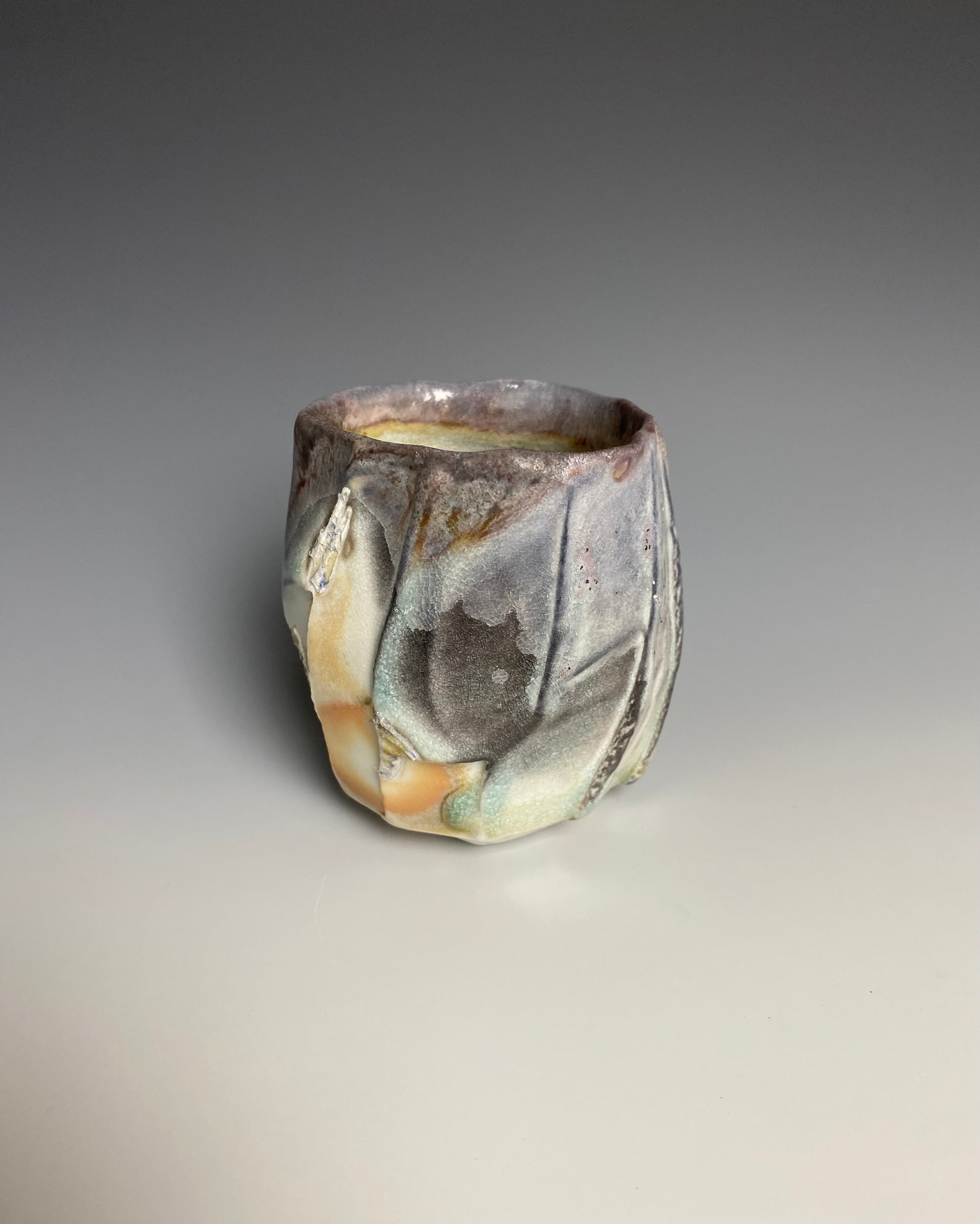 Wood fired faceted yunomi. Translucent porcelain clay. White shino liner glaze. 8 day firing using pine and oak. Natural ash glaze exterior. Fired on shells which left their mark. 3" wide at the rim x 3.75" tall.