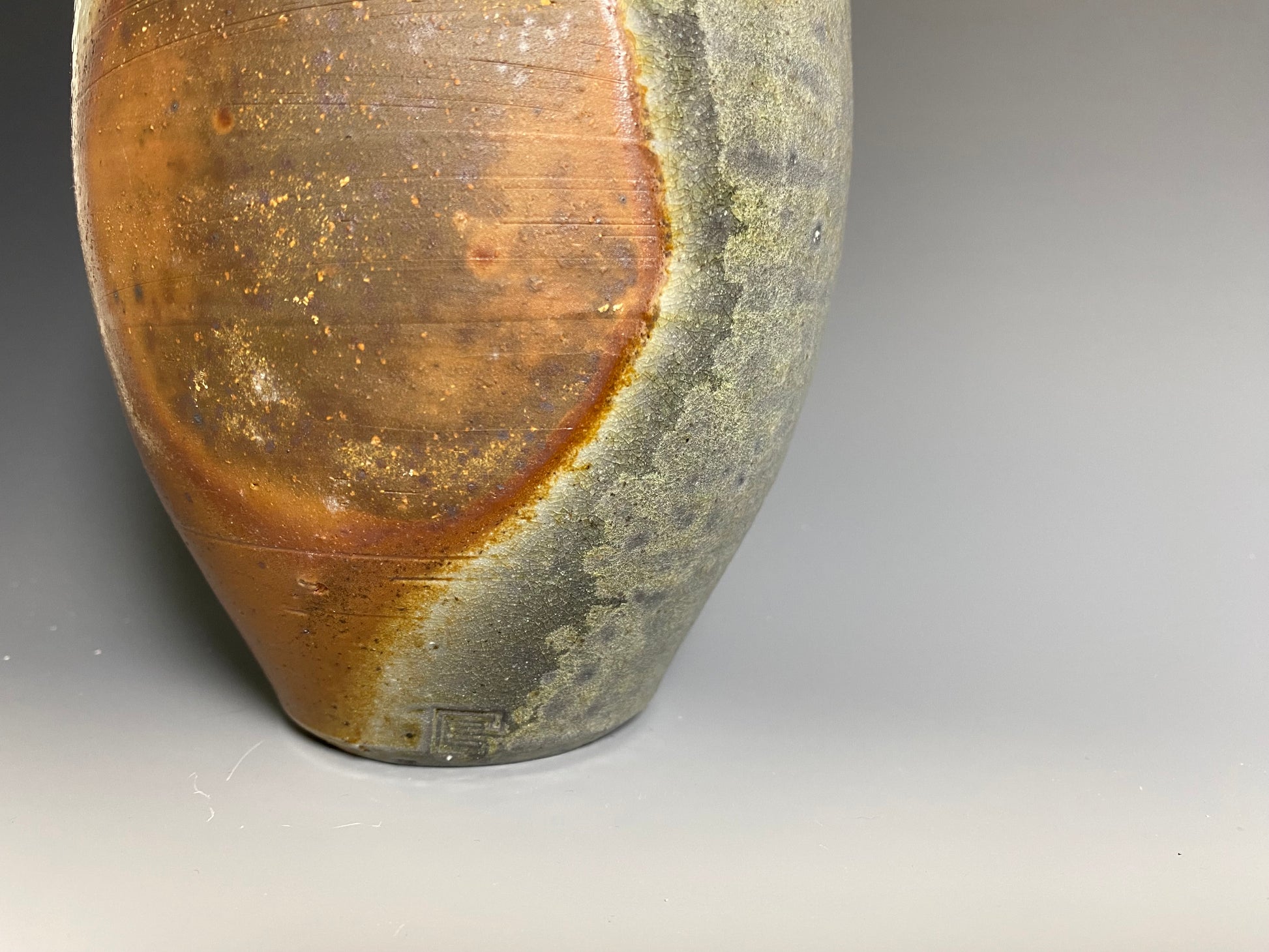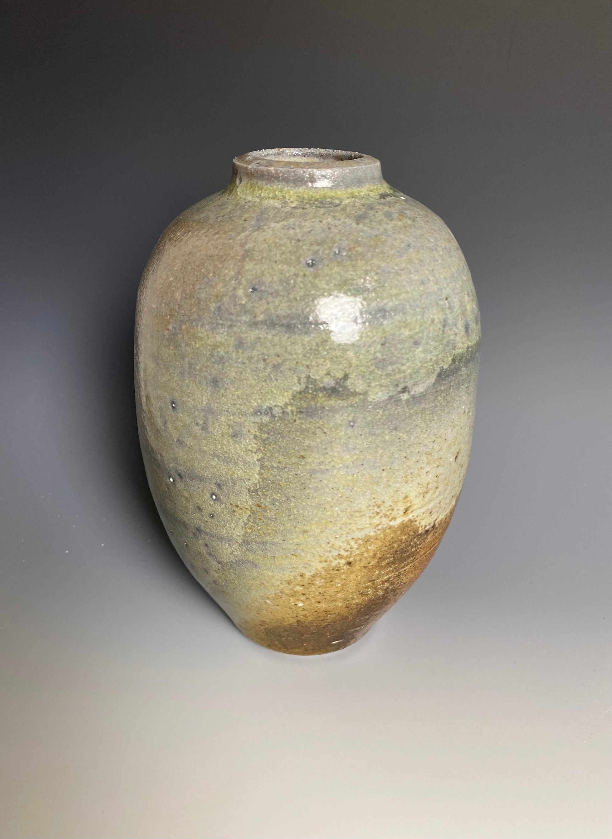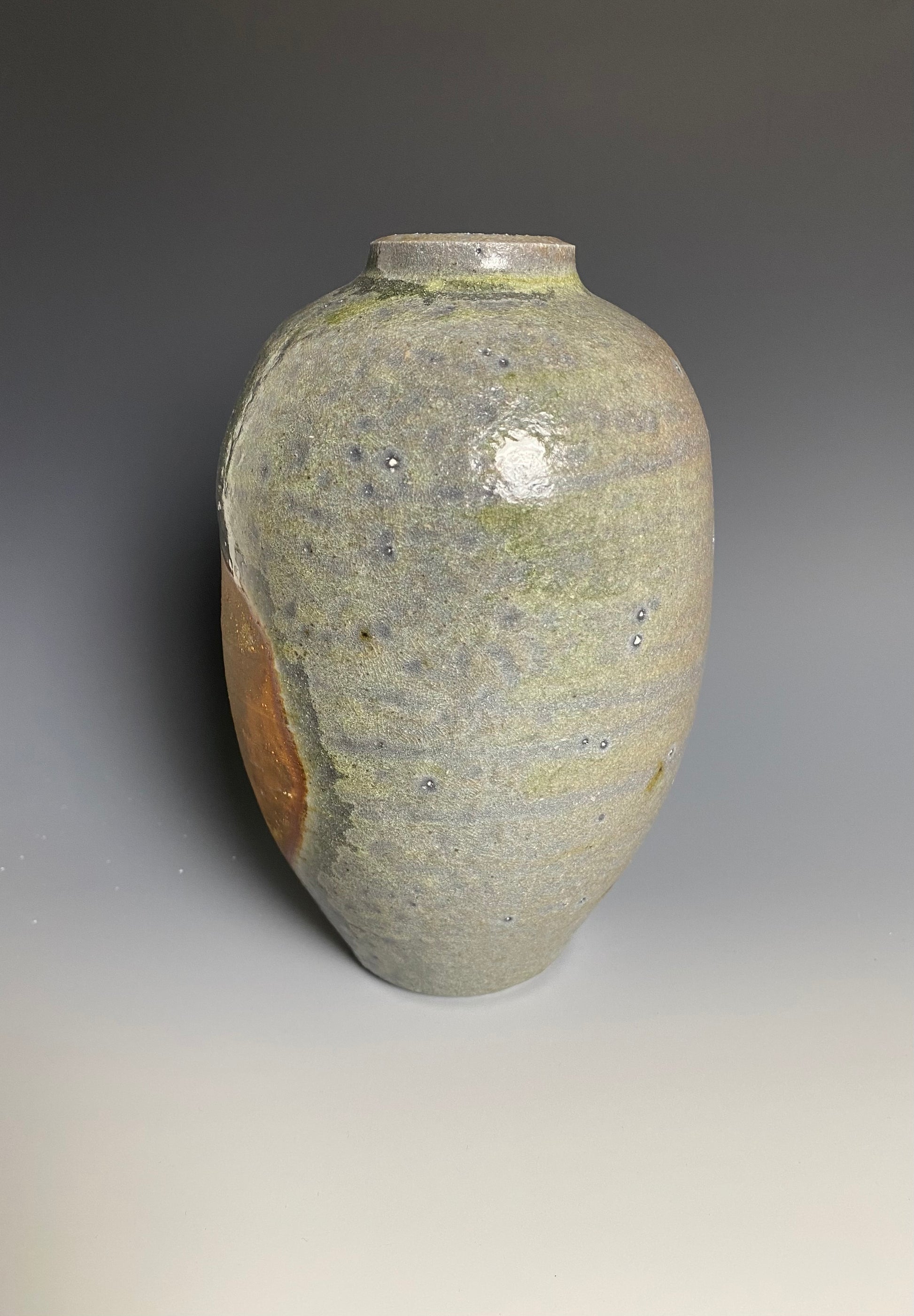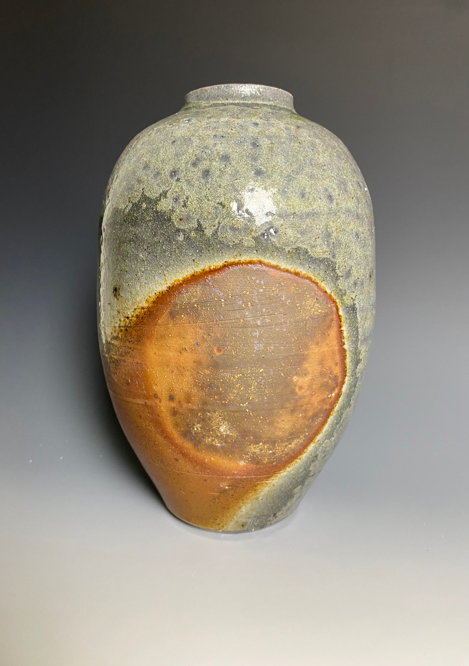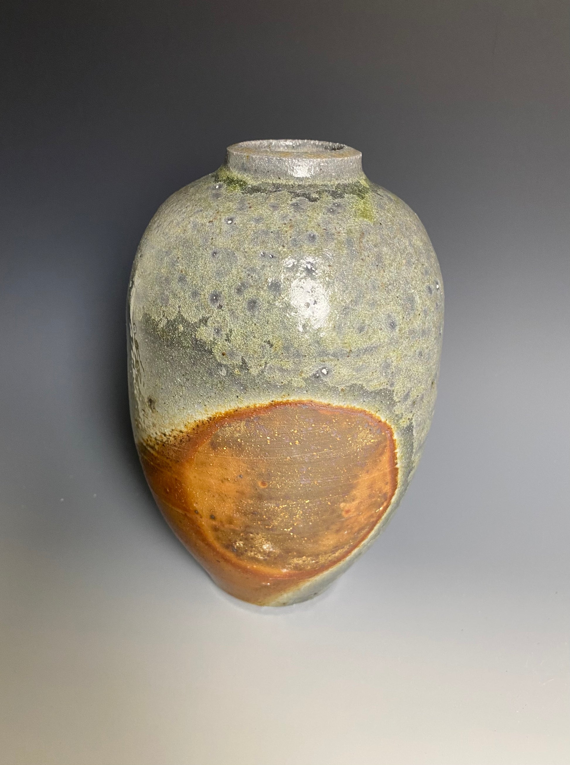 Wood fired vase with a natural ash glaze exterior. Shino liner glaze inside. Bare clay flashing from being fired on wadding. 8 day firing using pine and oak. 4.75" wide x 8" tall.